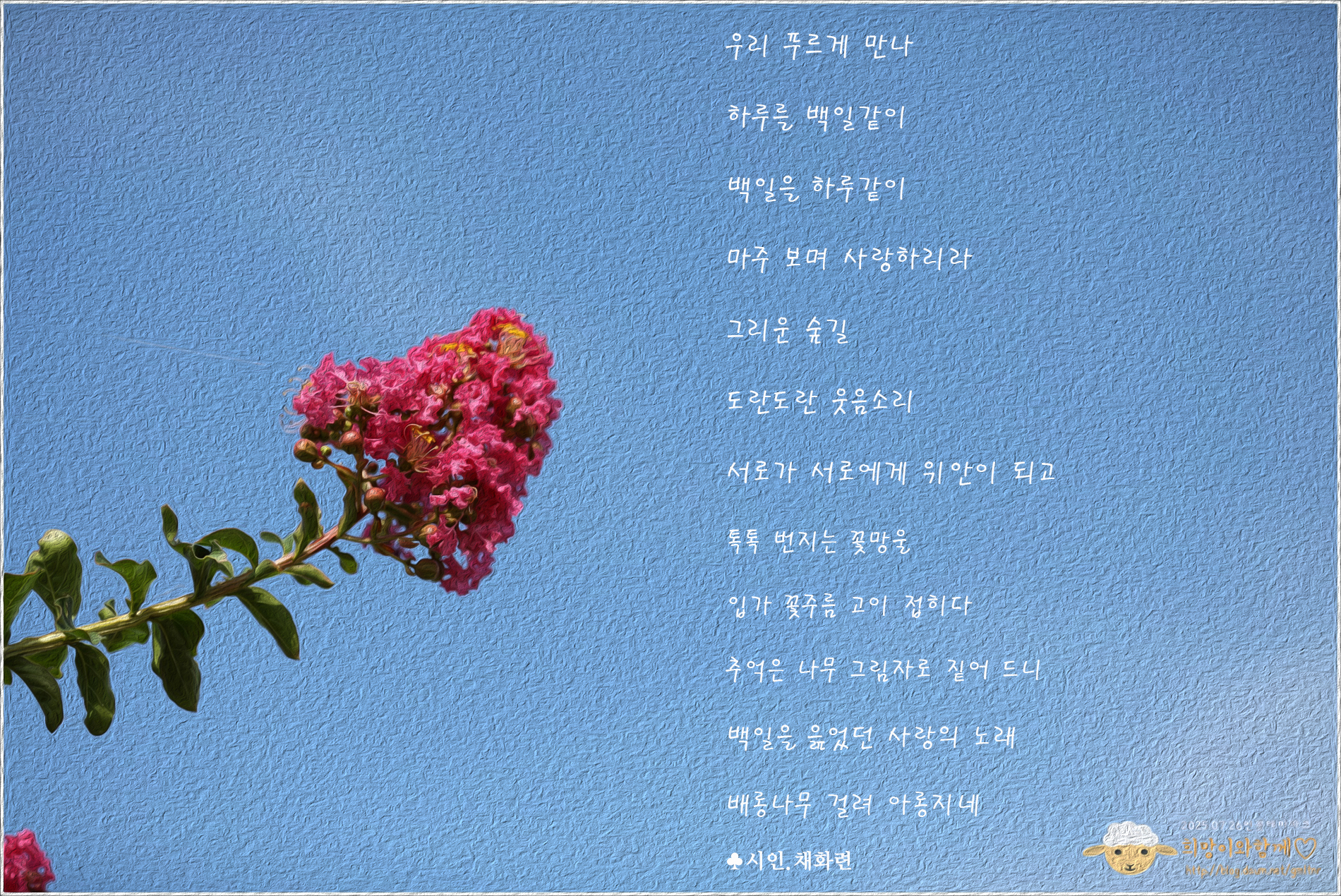 <해설> 채화련 시인은 시의 바탕을 이루는 정서가 매우 밝다. “마주 보며 사랑하리라” “하루를 백일같이, 백일을 하루같이”는 결국 “우리 푸르게 만나”를 전제로 한다. 1연에서 시인이 꺼내놓은 이야기는 노래일 것이고 백일을 읊었던 사랑의 노래일진대, 기억에의 반추가 노래로 살아나고, 시인은 지금 백일을 번갈아 꽃 피우는 배롱나무를 부러운 눈길로 바라보는 건 아닐까. 여느 꽃이 화무십일홍인 데 비하면 도란도란 100일을 피는 배롱나무를 꿈꾸는 시인의 사랑은 과욕일까? 희망 사항일까? 아무튼 시인의 상상은 톡톡 번지는 꽃망울로 입가 꽃주름 고이 접히게도 하겠다.